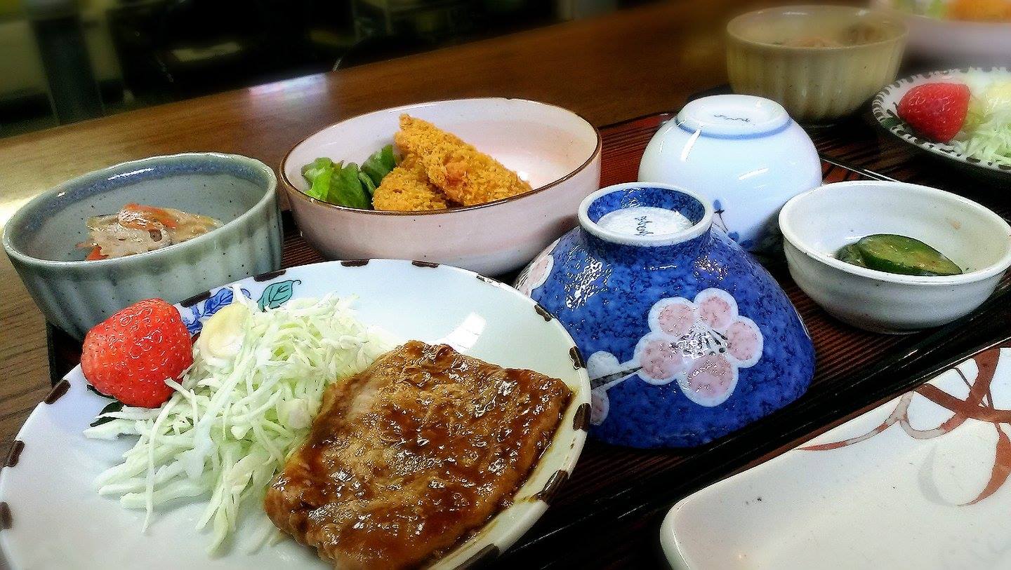 夕食は日替わりで、肉・魚料理、小鉢、お刺身、汁物、お新香が付いてきます。